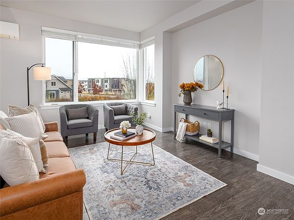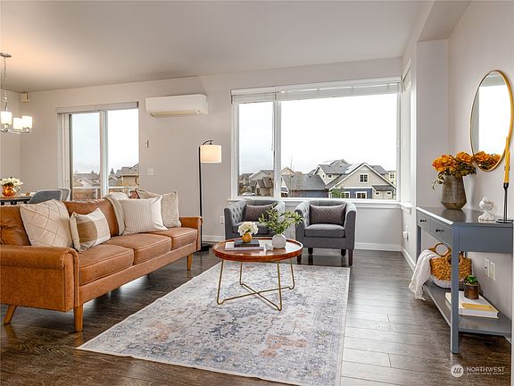 This stunning 3-bedroom, 1.75-bath home blends modern luxury with breathtaking views of Mount Baker and the Canadian Rockies. The open-concept design features solid surface countertops, tile, and resilient flooring, creating a stylish, functional space. A motorized retractable awning over the back deck adds shade, perfect for outdoor enjoyment. The primary suite includes a walk-in closet for added comfort, and storage under the stairs adds practicality. Built with eco-conscious living in mind, the home includes an upgraded solar package for energy efficiency and savings. The finished garage, with its epoxy-coated floor, adds a polished touch. Conveniently near a community garden, this home offers elegance, sustainability, and functionality.