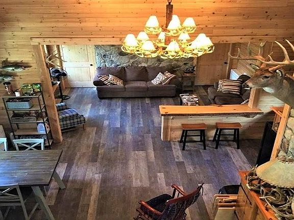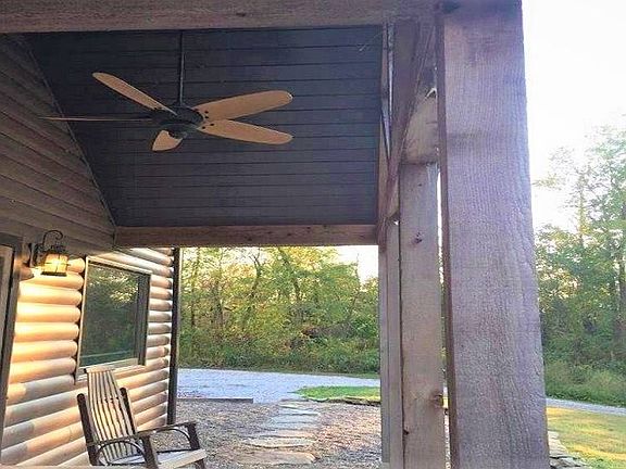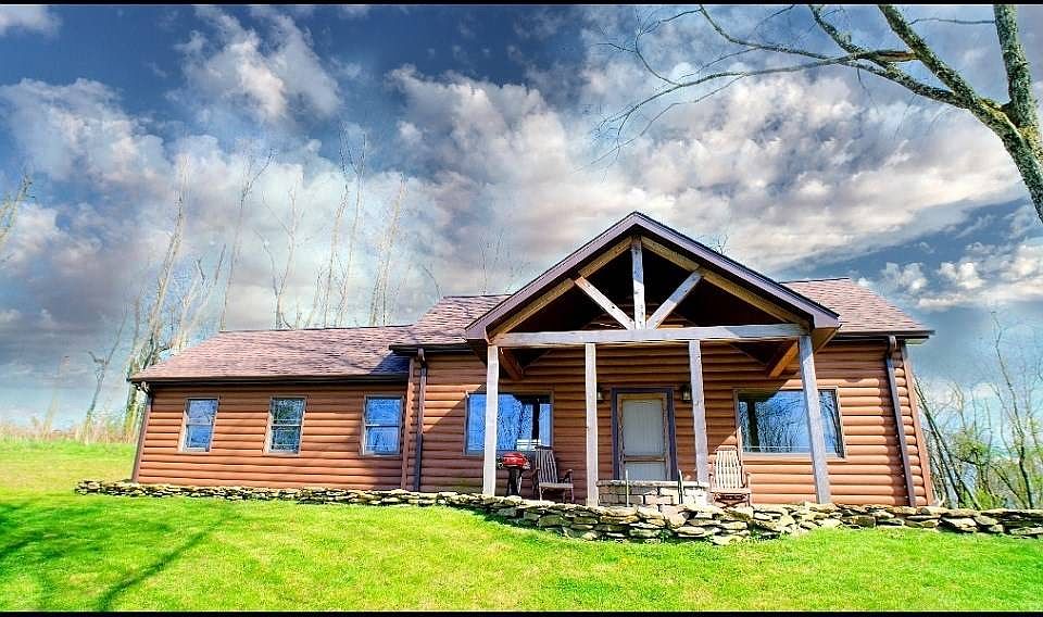 Harrison County, Ohio with a beautiful Vinyl Log sided 3 bedroom cabin with beautiful stone and cedar walls, decor with antler chandeliers throughout. With a gated gravel drive to its park-like setting with a beautiful view. It was built in 2017, with a new addition in spring 2019. Additional loft ready for storage or extra sleeping spots for your hunting buddies, along with all the amenities of home. There's a detached storage garage, great for keeping ATVs or equipment. It is located just 12 miles from Tappan Lake and only 18 miles from the Ohio River and is ideal for hunters and outdoor enthusiasts. CABIN DETAILS - Three bedrooms, one bath - Ladder access to loft - Vaulted ceilings - Two large antler-style chandeliers - Mudroom with washer/dryer hookups and sink - Front porch with ceiling fan and stone firepit - Built-in breakfast bar - Huge open floor plan - Log vinyl siding - Beautiful Cedar beam front porch with stone fire pit - Central air * Additional acreage adjoining House for sale of 96 acres with ponds and managed turn key hunting. * The owner has a third property of 127 acres for sale, on Croskey Road, in a separate listing.