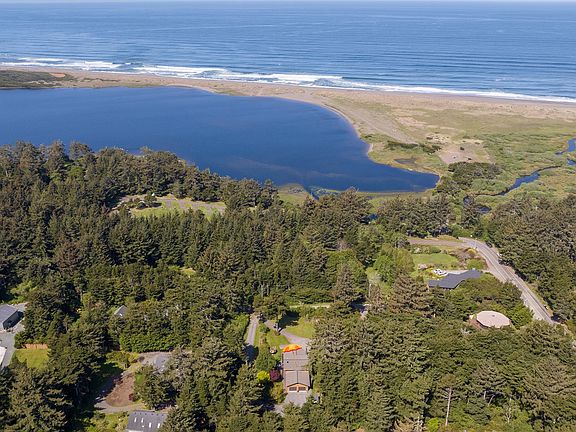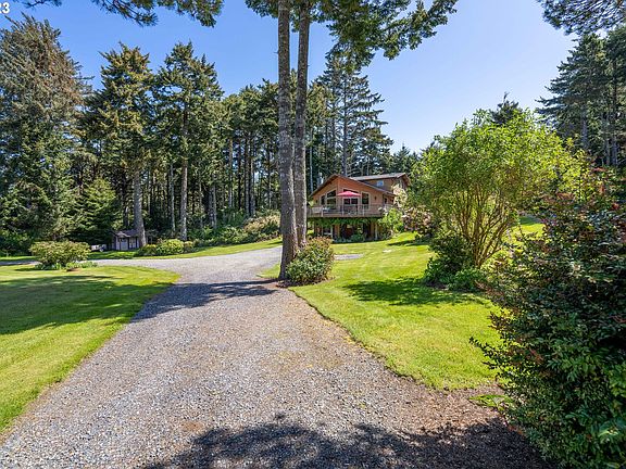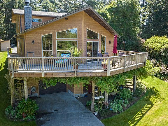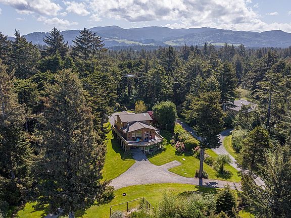 Leeward one minute walk from the waters edge at Floras Lake. Custom construction home built with locally sourced materials and high speed internet. Vaulted great room with Port Orford cedar ceiling, oak hardwood floors, wood burning fireplace with slate accents, wall of windows with a territorial view. Kitchen features custom island/bar, stainless steel appliances, gas cooktop with hood and cherry wood cabinets. Primary suite with office nook, vaulted ceiling, bamboo floors, double skylights, double walk-in closets and bathroom with radiant heat tile floor. Nature from every window. Wrap around generous deck sets the stage for outdoor entertaining. Hobby room/shop is a daylight basement with 1,305 square feet. Covered front porch with half acre of manicured yard and rugged coastal hedge borders. Outbuildings include garden shed and wood shed. Walk to the lake or beach. Variety of lake activities include windsurfing, kiting, SUP, kayak, jet skies, motor boat touring and fishing. Explore, hike and beyond. Located 20 minutes south of Bandon by the Sea & 30 minutes south of Bandon Dunes Golf Resort.