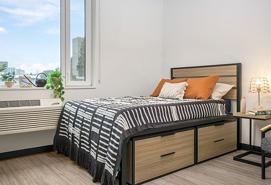 The unit is on the 7th floor, and is the biggest room of it's kind. The room comes with a personal attached bathroom, and the entire unit has wooden flooring. Utilities and AC are included, is fully furnished, is pet friendly, spacious living room and a washer and dryer are included within the apartment. The lease will end August 26th, 2025. Unless you already have insurance to cover the apartment, it will be an extra $15 per month for coverage. It will be an extra $25/month for any pets. No smoking, and if you want parking, you must sign up for it through the apartment. There may be a waitlist.