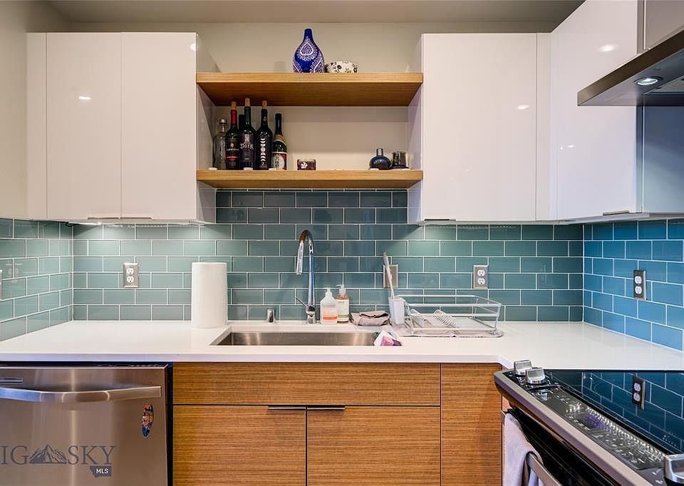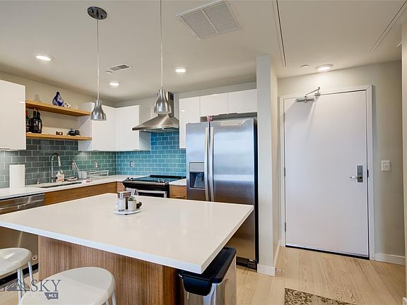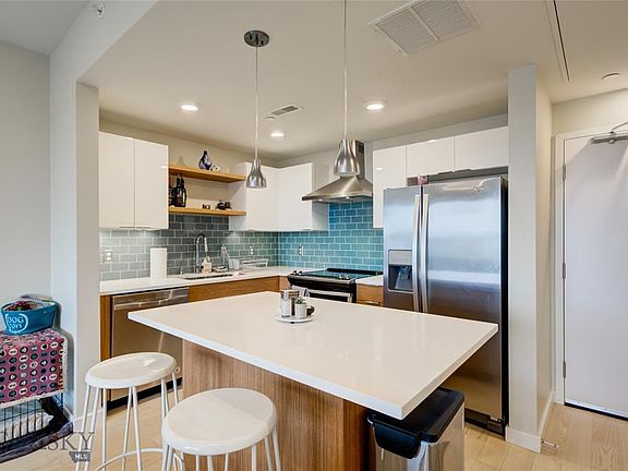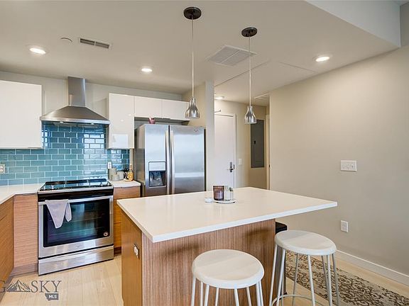 You won't want to miss this turn key condo on the South side of Bozeman, near the MSU campus, Oracle, and hospital. The contemporary finishes of this 1 bedroom, 1 bathroom Talbach House Condo include quartz counter tops, tile backsplash, hardwood/laminate floors, LED and blue tooth bathroom mirror, tiled shower, and efficient European windows and doors. Enjoy views of the Bridger Mountains and the "M" from the balcony. This unit has an assigned carport and central A/C. The Talbach House Condos offer a lobby, coded entry for all exterior doors, elevators, and two gyms. The washer and dryer are in the master closet for easy access, and they convey with the sale.