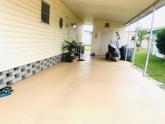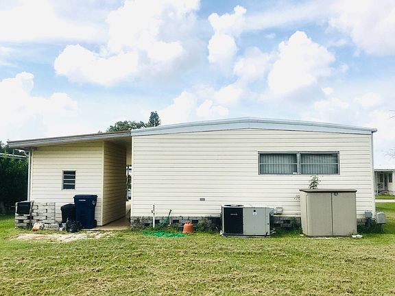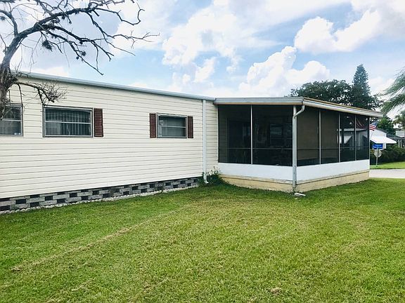 THIS HOME IS IMMACULATE and priced to sell! 2 Bedroom, 2 baths. Has newer vinyl flooring throughout. LOADS of cabinets and closets everywhere. Kitchen with dishwasher, wall oven, cooktop, microwave, and new refrigerator. Open living and dining areas with built-in hutch and more storage in dining. Master bedroom is very large, and has new Bath Fitter in over-sized shower and large vanity. Large walk-in closet and additional double closet. 2nd bedroom has built-in storage, shelving, and 2 large closets. Off the living room, step onto a spacious screened lanai with a ceiling fan, to enjoy morning coffee or evening cocktail with unobstructed view of beautiful palm-lined street. Large outside shed with workbench, washer and dryer. Extra long carport can park three cars. Located on a quiet street. This home is move-in ready. Lot rent $806 monthly. 55+ Leased Land Community. All listing information is deemed reliable but not guaranteed and should be independently verified through personal inspection by appropriate professionals. Integrity Mobile Home Sales cannot guarantee or warrant the accuracy of this information, measurements or condition of any property. Measurements are approximate. Lot rent is subject to change.