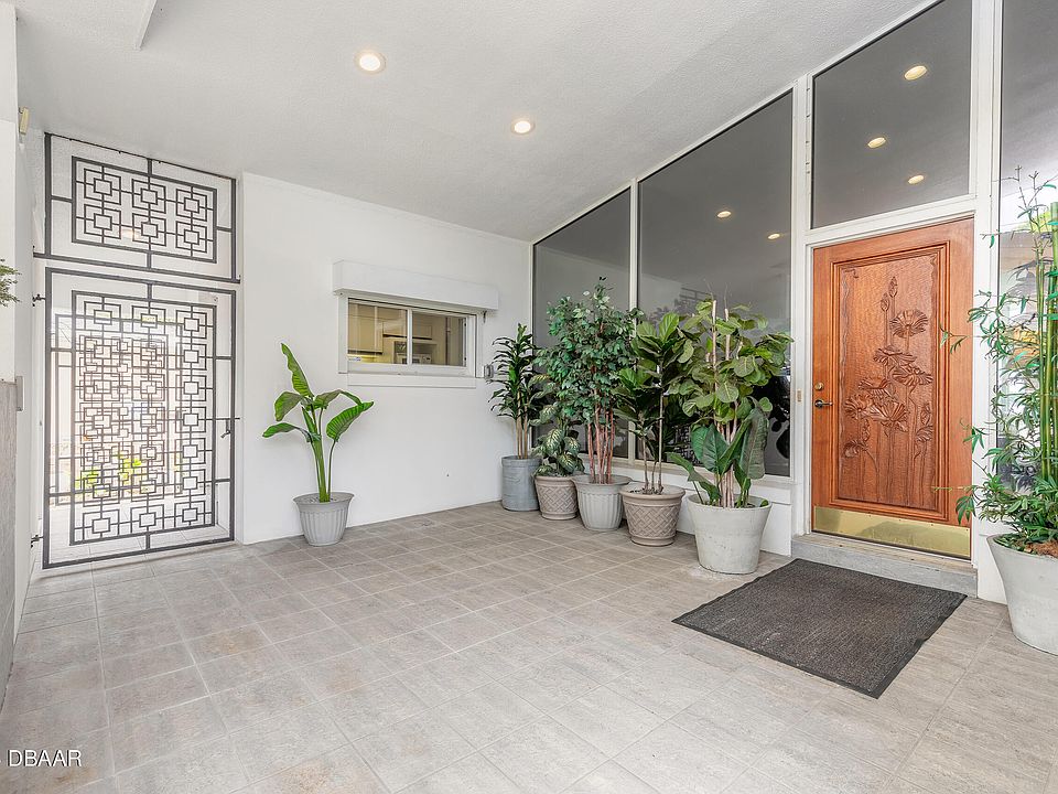 Opportunity is knocking! Enchanting and timeless sanctuary on the Halifax River. 3 bedroom, 2 bath mid-century classic with vaulted ceilings and panoramic views is a riverfront haven for anyone seeking beauty and tranquility. The landscaped garden setting creates an oasis along the riverfront. Unique touches throughout such as the custom entry and custom wooden carved door suggest attention to detail and add character to this one-of-a-kind home. Filled with natural light, this haven becomes the perfect blend of indoor comfort and outdoor beauty. Must see to appreciate. Priced reasonably for a riverrfront home.