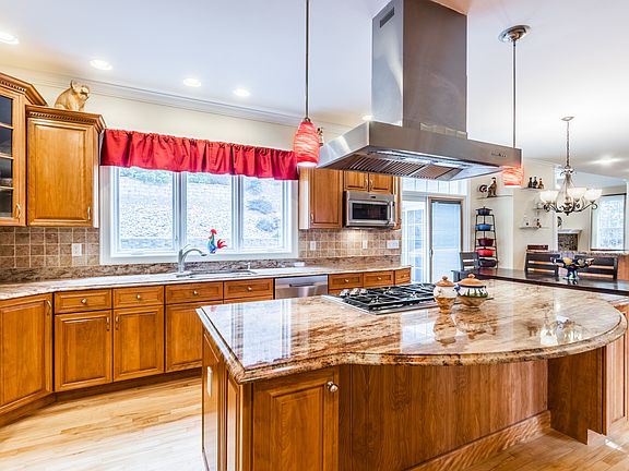 Elegant colonial style custom home located on .9 acres at the end of a cul-de-sac. 2 story entry foyer leads you into this house with a very open first floor plan that is excellent for entertaining. It has 4919 finished square feet and an additional 2150 square feet of unfinished basement with roughed in plumbing for a full bathroom. The attic is fully floored and can be used as storage or could be finished. Pella windows throughout the house. The master bedroom suite is large enough for a sitting area and has a large (11x11) walk-in closet that includes wall-to wall cabinets/drawers/shelves and racks. There are 3 additional large bedrooms and a spacious bonus/office/den space on the second floor. Three bathrooms are located upstairs and an additional ½ bath on the first floor. The master bath has a whirlpool tub, dual vanity sinks and a glass enclosed tiled walk- in shower. The first floor boasts a large gourmet kitchen with a curved island supporting a breakfast bar. Granite counters and backsplash, and high end stainless steel appliances make this kitchen both great to use and fun for entertaining. The Wolf cook top has both a down draft as well as a professional overhead venting system. A large dining room opens directly to the kitchen. There is also a lovely bar/game/sitting room area with a gas fireplace. The family room has cathedral ceilings, skylights, another gas fireplace and sliding doors that open to the patio. Bruce hardwood floors.