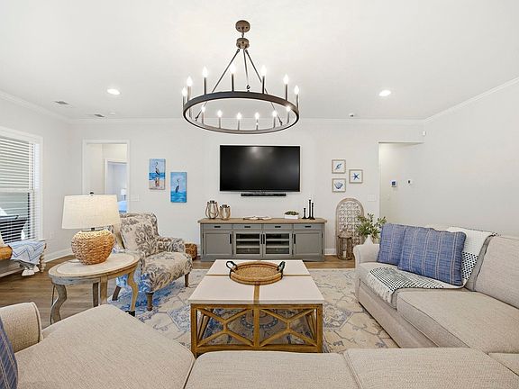 Fall in love the moment you step through the foyer of this stunning 3-bedroom, 3-bath home where thoughtful design meets everyday comfort. This well-maintained home features durable cement fiber exterior, with the exterior freshly repainted in October 2025, offering peace of mind and great curb appeal. Warm LVP flooring flows throughout, leading you into a bright, open-concept living space where a dramatic candle-style ring chandelier instantly steals the show and sets the tone for modern living. Work from home in style in the dedicated office featuring French doors and beautiful wainscoting. The spacious primary suite feels like a private retreat with a tray ceiling, large walk-in closet, and spa-inspired ensuite offering a double vanity and walk-in glass shower. A second bedroom enjoys its own ensuite bath, while the third bedroom and separate full bath provide ideal space for guests or family. The kitchen is designed to bring people together featuring a breakfast bar that doubles as an island, complete with four breakfast bar stools that convey. You'll enjoy the abundant cabinetry, a separate pantry, and a gas range with a hood. The charming dining area with wainscoting opens to a screened back porch with coffered-style trim and a ceiling fan, perfect for morning coffee or evening gatherings. Step outside to a patio and fire up the gas KitchenAid grill which conveys, while enjoying a professionally landscaped, oversized backyard on a rare half-acre lot. Most furnishings are negotiable, offering added flexibility for buyers seeking a move-in-ready opportunity. A well-appointed laundry room with custom built-in storage and a sitting bench adds even more everyday convenience. The 2-car garage plus 1 golf cart space rounds out this exceptional home. Enjoy resort-style community amenities including an extra-large pool, fire pit, and playground. This home doesn’t just check boxes, it creates a lifestyle you’ll be proud to call your own.