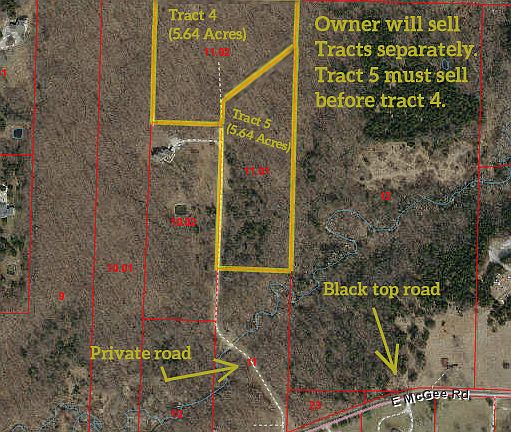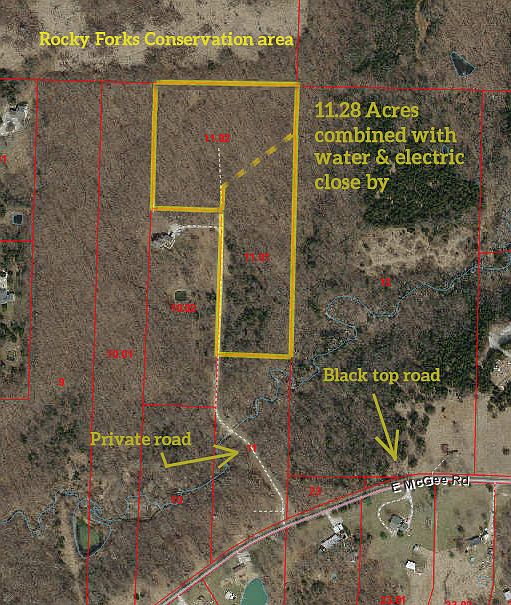 5-10 Minute Drive to Columbia-Build your DREAM HOME or Enjoy as Recreation! Heavily wooded 2 tracts- 5.64 acres each (11.28 combined) with access to water & electricity. Blacktop road frontage to private drive. Backs to Rocky Fork Lakes Conservation Area - 2200 acres of public hunting & fishing, over 60 lakes/ponds, largest lake is 52 acres. Can sell 5.64 acre tracts separately, see private remarks. No Mobile Homes allowed. Buyers to verify all listing information.