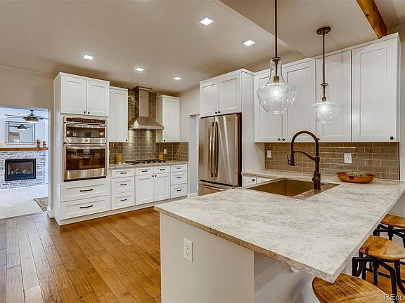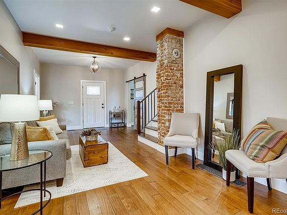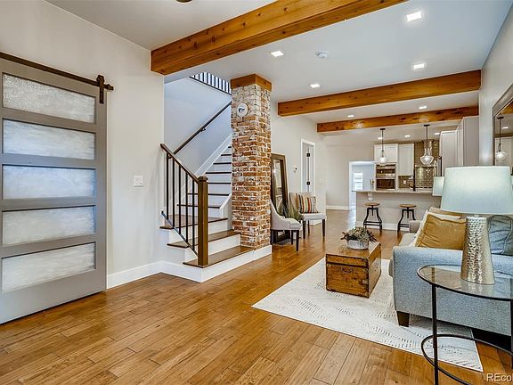 WELCOME HOME! Move in by Thanksgiving! Beautifully renovated, this modern farmhouse is move in ready! The well appointed Chef's kitchen will not disappoint and includes Smart appliances, a gorgeous leathered marble island and oversized farm sink. Right off the kitchen is a nice sized dining room making dinner to table a breeze! Step down to the cozy den with french doors, a brick fireplace and wet bar for entertaining. Second level has a reading/sitting room with an outdoor deck, water features & city views! Master bedroom is large and airy with partial mountain views, large private bath that includes Carrera marble shower & vanities, a free standing soaking tub and original wood wall accent. Second upper bedroom includes an en suite bath that could be a 2nd Master. The large fenced back yard has an additional deck and fire pit area for entertaining. An automated remote controlled gate will open to the oversized 2 car garage. Additional parking areas in back yard which can accommodate RV as well as street parking! This Smart Home features Levitron smart lights, RING doorbell, gas range is WI-FI & Bluetooth, family den has 4 surround sound speaker hook ups in ceiling with cable for TV, USB charging outlet in kitchen. Remote control gas fireplace and 3 ceiling fans all with remotes. All LED lights have 3 positions to change color and mood. Motion light in pantry and outdoor lights above garage. Also included are two rustic water features. Conveniently located in the friendly Sunnyside neighborhood, this lovely home has easy access to I-70 and is walking distance to Cobbler's Corner, Earnest Hall, Starbucks and 2 blocks to Rocky Mountain Park. Excellent bike trails, light rail and downtown Denver is a short 5 minutes walk/bike/ ride away!