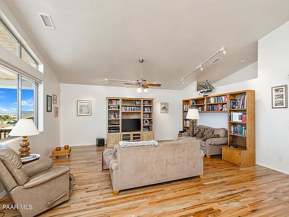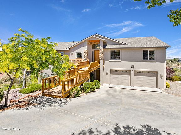 If you seek expansive and flexible living space, exceptional storage, stunning and unobstructed mountain views, and over an acre of property just minutes away from the heart of Prescott, you've found the right address. Located on an interior street in Longview Estates, this 4 bedroom/3.5 bath split floorplan home is bright with natural light, filled with carefully selected upgrades, and beautifully maintained. Two large great rooms - one on each level - provide comfortable central gathering spaces; each has access to its own huge, covered deck, where entertaining extends to the outdoors and 60 miles of Arizona landscape takes your breath away. Generously sized rooms throughout: the upper level offers a master suite, chef's kitchen and dining area, laundry, powder bath, 3 secondary