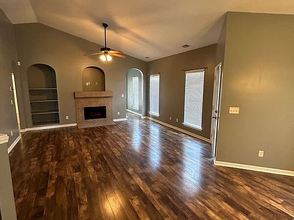 This beautiful home offers a spacious living room complete with a cozy fireplace, creating a warm and inviting atmosphere. The kitchen comes equipped with a refrigerator, stove/oven, and microwave, providing everything you need for easy meal preparation. Adjacent to the kitchen, the dining room features built-in shelves and is bathed in natural light, making it a perfect space for family gatherings or casual meals. The master bedroom, located at the rear of the home for added privacy, is a peaceful retreat with convenient access to the backyard. The master bathroom is designed for comfort, featuring double vanities and a garden tub/shower combination. Outside, the large fenced backyard includes a patio with both covered and open spaces, ideal for relaxing or hosting outdoor events. Other highlights of the home include a 2-car garage, washer/dryer hookups, ceiling fans, air conditioning, and impressive vaulted ceilings. As part of a vibrant community, residents have access to a clubhouse, swimming pool, tennis courts, walking trails, and a private lake. Conveniently located near interstates, shopping centers, and popular restaurants, this home offers the perfect balance of comfort, amenities, and accessibility. Pets: One or two dogs, but no cats. Residents are responsible for all utilities. Application; administration and additional fees may apply Pet fees and pet rent may apply All residents will be enrolled in a Benefits & a Building Protection Program, contact Evernest for more details A security deposit will be required before signing a lease The first person to pay the deposit and fees will have the opportunity to move forward with a lease. You must be approved to pay the deposit and fees. Beware of scammers! Amenities: Washer/Dryer Hookups, Fireplace, Ceiling Fans, Air Conditioner, Vaulted Ceilings, Walk-In Closets, Patio, Fenced-In Yard, Gutters, Pool, Clubhouse, Tennis Courts, Playground/Park, Refrigerator, Stove/Oven, Microwave, Dishwasher, 2-Car-Garage