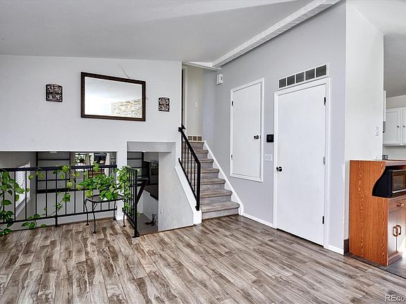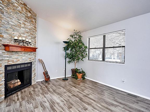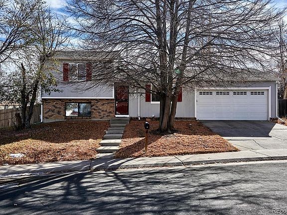 This home has a LARGE fenced back yard with a deck and storage shed. Updated home in Summer Valley with mature trees in front yard and cement steps to the front door. The living room has wood look laminate floors and a beautiful cut stone wood-burning fireplace with a wood mantle. It is open to the eating area with beautiful wood accent walls and wood trimmed doors and windows. The kitchen is beautiful with white cabinets, stainless steel appliances, granite countertops, tile backsplash, double sink under the window, tile floors, and a beautiful wood accent wall. The entrance to the double car attached garage is in the eating area and there is also a door to the backyard It is a very large fenced in backyard!!! The deck has a custom hexigon shape for the table and a smaller hexigon shape for the fire pit. Horseshoe pits are in the backyard for fun and a large wooden shed for extra storage. From the living room you go down to the family room with built in shelves along one wall. There is plenty of room to gather and enjoy friends and family. Off the family room is the third bedroom and an updated 3/4 bath with a glass bowl sink and tiled shower with a glass door. There is a washer and dryer in the laundry closet. From the living room you go upstairs to the large main bedroom with a door to the bathroom and a walk-in closet. The updated bathroom also has an entrance from the hall and has an updated vanity, tile floor, tub with tile shower surround and a rain shower head. The second bedroom has a walk-in closet too. This house is in Cherry Creek school district and has a bike trail along Wagon Trail Pkwy. It has easy access to stores, restaurants, recreation, and major highways. This home has been lovingly cared for and updated. The kitchen appliances are only 3 years old, gas water heater 2 years old and a new furnace installed Feb 2022. The home is west facing to see beautiful sunsets from the front and sunrises from the back.