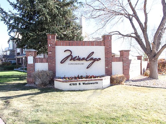 Fantastic 3rd-floor Miralago Condo in Littleton offers 2 bedrooms and 1 bathroom. Bright, open floor plan, sunken Living Room with vaulted ceiling and rare wood-burning fireplace with brick surround. Kitchen offers countertop seating/breakfast bar, and black appliances. Master suite has vanity and separate access to full bathroom with deep tub, and a private deck with lake views! Amazing community pool with hot tub, club house, and fitness center. Great condo! Great Wadsworth location! Call now to schedule your personal showing!