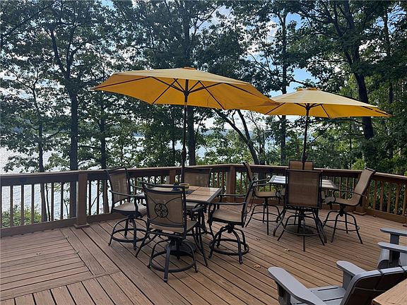 A wonderful 3 bedroom, 3 bath year-round ranch home with 133' of lakefront, 3.59 acres and sunsets! There is a wide breezeway that leads to the house, the garage and the deck. The 1st floor interior of the home is a very spacious and open area that includes the kitchen, dining area and living room. The kitchen has a ceramic tile floor, oak cabinets, built-in oven, microwave, large island that includes a Jenn air cooktop, dishwasher, and solid surface sink area and loads of counter space. The living room has hardwood floors with area rug and sliding doors to the wrap around deck on the lakeside of the home. The primary bedroom has a sitting area, walk in closet and full bath with double sinks and heated floor. Bedroom 2 and 3 have a common (Jack & Jill) bath. The Lower Level is finished and has slider's to a walk out patio that looks over the lake. There is a family room, tv area, full bath, laundry room, small workshop and utility room plus a wall of closets. All doors and windows are Anderson. Stereo speaker system inside and out. The oversized 2 car garage has plenty of space for the lawn mower, gardening tools and beach and dock furniture. Easy access steps to the beautiful level beach, dock and boatlift. Plenty of depth at the docks edge. What's most unusual with this lakeside property is the additional lot which gives you privacy and other options. The blacktop road is another benefit. There is a lot to like with this property!