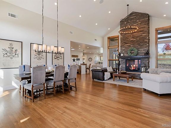 A beautiful residence, finished in 2021 -- a timeless interior that features modern farmhouse elements with rich beams and stone, perfectly capturing the natural beauty of Colorado. The inviting, open floor plan is all main level living, and the covered outdoor patio with a fireplace is ideal for entertaining friends and family. The great room is centered around a floor to ceiling stone fireplace, soaring vaulted ceilings, and natural oak floors. The space flows seamlessly into a gourmet kitchen featuring a six burner Thermador stovetop with a griddle, pot filler, and stainless-steel backsplash and hood. The large island, stylish and functional butler's pantry, double refrigerators and two dishwashers allow for easy hosting or simply adding space and ease for everyday mealtimes. The home features a large circle driveway providing ample parking for guests, four car garage – three for cars and one for your toys, as well as an open unfinished basement with a workshop. A beautiful front porch with mountain views, The Club at Pradera golf course, and neighborhood amenities complete the serene setting – this home has it all!