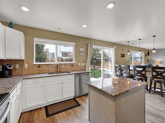 Highlands Ranch escape close to everything including a short walk to the Rec Center or Shopping. This South-facing home with new jellyfish outdoor lighting, stamped concrete patio and maintenance free turf. Enter into a soaring great room — perfect for a formal dining space and sitting area. Updated vinyl plank floors flows into an additional great room space with a gas fireplace for hours of entertaining. The great room flow into the spacious kitchen is a home chefs with an informal dining area, stainless steel appliances, generous counter space with custom concrete bar. Open stairwell with new railing and bolsters to an upper-level with a large loft and good sized 3 bedrooms. Among these serene spaces is a primary suite is well equipped with a walk-in closet and a double shower in the updated primary bathroom. Newly finished lower level has created a personalized escape for movie nights or your cheer on your favorite team. The recreation room has plenty of space for your biggest furnishing and a small dry bar. Rounding out the lower level is a large 4th bedroom. The stamped concrete outdoor patio is surrounded by private fencing and mature plantings and turf space for the 4 legged friends. Enjoy super easy access to open space, parks, trails and walk to Southridge Recreation Center/Park.