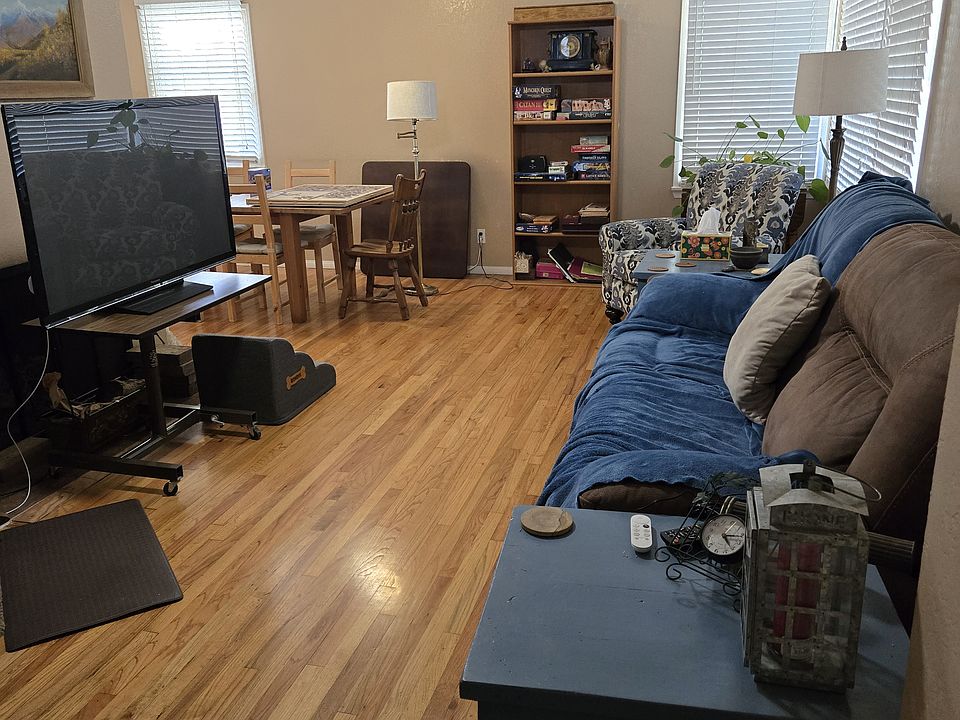 2 bedroom/2 bath front house apartment available in a 4 bedroom, 3 bath, 2500 sq ft. home in Riverside. The house is located in a neighborhood with nearby shopping, not too far from access to the 91 Fwy. Split electric 50%. Average share 100/month PROXIMITY: Nearby 91 fwy-10 min Shopping/ movies at Riverside plaza- 5 min UCR, RCC, CBU- 10 min Downtown Riverside- 15 min Two bedroom (one queen, one twin) two bath, living room, spacious kitchen. Pool table! Furnished and ready for move in. Landlords onsite in second apartment, occasionally will share kitchen but the refrig is yours. NO MORE PETS PLEASE. We already have one dog onsite. WHAT YOU GET: Central air and heat Ceiling Fans Light fixture Large mirrored door closet in each bedroom. Storage cabinets throughout. Living Room, Dining room, Kitchen, pool table. Spacious kitchen with Gas Stove/Oven, Dishwasher, Refrigerator, Microwave Blinds, black out curtains in bedrooms, blinds on all other windows. Skylight Internet LEASE TERMS: Month to month with signed lease and roommate agreement. Security deposit $900. Message me here or text with your name and a brief summary of yourself. I will contact you back quickly. ABOUT the Landlords: Landlords live onsite in second apartment. We are a semi-retired OG nerd couple who travel a lot. LGBTQ+ friendly. Thanks for looking. Month to month. No smoking.