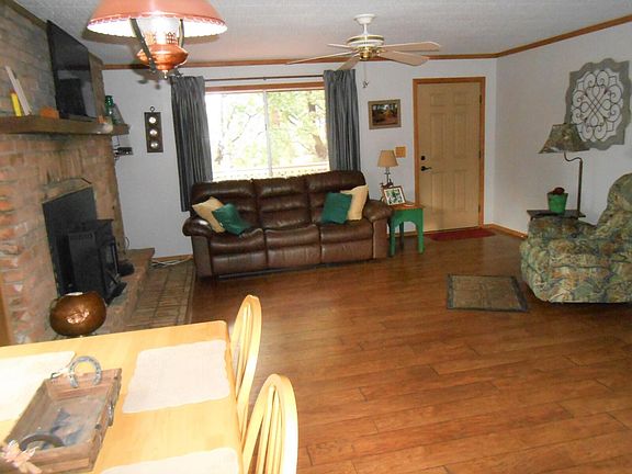 One of a kind! Well maintained home that looks newer than it is. Recent laminate flooring and roof. Large pantry in the hallway. The decks were just refinished. The massive fireplace with pellet insert is faced with brick inside and stone outside. Very private setting in the trees with a fenced grass dog run with automatic sprinklers. The triple size garage has a 2 car door and a large workshop or space for your toys. There are also a paved circle drive and a playhouse. Just over 200 feet to the National forest. There is a well on the property previously used for irrigation, but the sellers have not used it. Ceiling fans throughout, and oil filled electric baseboard heat.