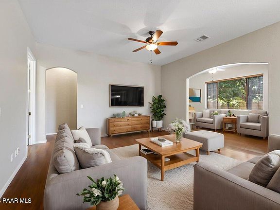 Beautiful updated Granville home with a very unique layout. This 3 bedroom 2 bathroom home features a split floor plan, open living/ dining kitchen combo and great outdoor space. The large primary bedroom ensuite features dual vanity, full bath, and large walk-in closet. The guest bedrooms are both large, one features a walk in closet. All three bedrooms are separated giving each occupant privacy. 10' ceilings add so much to the spacious layout. The front and back yards are fully landscaped and there are mature shade trees and fruit trees in the back yard with a great patio for enjoying the outdoor space. Granville has 3 clubhouses and a low HOA, it is a great community conveniently located to everything Prescott and Prescott Valley has to offer!