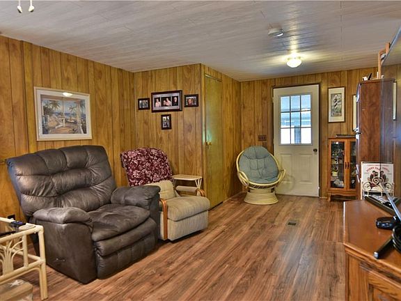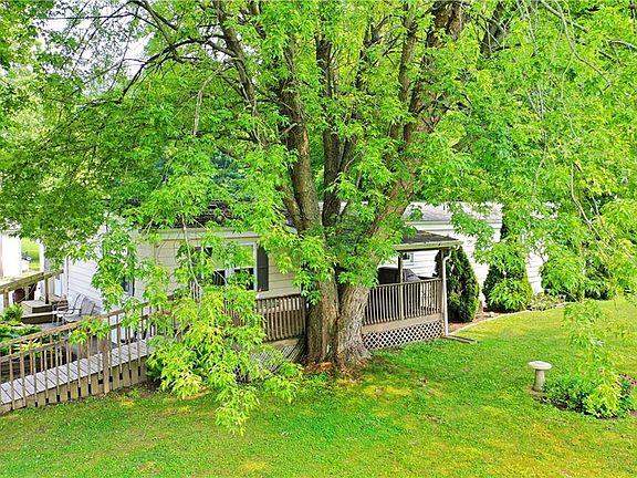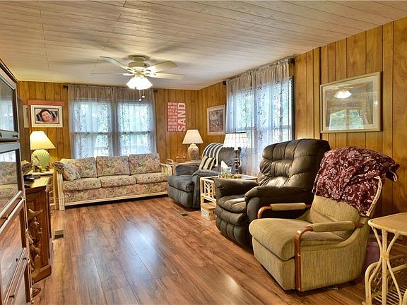 Tucked away beneath the trees on over one acre of land lies this inviting three-bedroom Cortland ranch; boasting warm and inviting living space with its wood trimmed interior that creates a cabin-like feel. The cozy residence is handicap accessible with its prominent frontal ramp that leads to a covered front patio and sliding glass entry way. Spacious rooms each boast large footprints that wrap around a unique central island, lined with cabinets at each side. The living room branches off into two separate dining areas which include the formal with fireplace and corner office and an additional that overlooks the kitchen. A full bath joins laundry service and hidden utilities in the main hall as the three bedrooms branch away. The largest, master bedroom includes a deep-set full private bath with stylish vanity and shower with unique built-in seating.