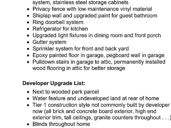 The owners also have upgraded the property in many ways to enhance luxury and practicality. On the exterior, those upgrades include an extended concrete patio with a custom outdoor kitchen and bar that match the house, with leathered granite countertops, stainless steel refrigerator/kegerator with dual tap system, and stainless steel storage cabinets. Other exterior upgrades include a low maintenance vinyl fence for the backyard, a sprinkler system for the front and back yards, and gutters. On the interior, the upgrades include professionally installed epoxy paint for the garage floor, shiplap and upgraded paint in the half bathroom, a Ring doorbell system, a refrigerator for kitchen, upgraded light fixtures, and pull-down stairs to the attic along with a permanently installed wood flooring in the attic.
