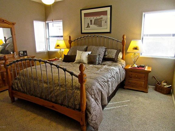 Wow! Photos do tell the story! This Verbena boasts two bedrooms, 2 1/2 baths, and den with built-ins. The rear of the home has been expanded to showcase the mountain view from a wall of windows. The kitchen is beautifully appointed with custom knotty alder cabinets, granite counters, and built-in buffet, accented in tasteful colors of the Southwest. The home features a spacious master bedroom, master bath with a custom walk-in shower, large laundry, and an oversized dream garage. Step to the back patio to enjoy the unobstructed, panoramic mountain view. The outside living area is an entertainer's dream--ideal for intimate groups or to host a large gathering of family and friends. Watch the ever changing Santa Ritas while enjoying your morning coffee or afternoon cocktails.