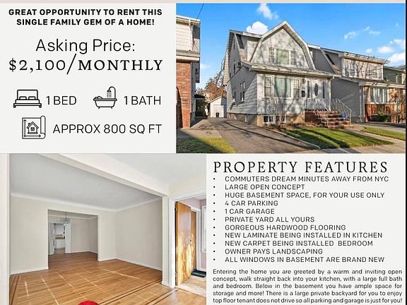 Spacious and move in ready! This is a rental that feels like your own home! Saturday - December 3rd 1:00 PM -3:00 PM 477 Columbia Ave, Ridgefield, NJ 07657 $2,100 1 , 1 : And This could be your new home! ! COMMUTERS DREAM MINUTES AWAY FROM NYC LARGE OPEN CONCEPT HUGE BASEMENT SPACE, FOR YOUR USE ONLY 4 CAR PARKING 1 CAR GARAGE PRIVATE YARD ALL YOURS GORGEOUS HARDWOOD FLOORING NEW LAMINATE BEING INSTALLED IN KITCHEN NEW CARPET BEING INSTALLED BEDROOM OWNER PAYS LANDSCAPING ALL WINDOWS IN BASEMENT ARE BRAND NEW Great opportunity to rent this single family GEM OF A HOME! Home features, 1 bedroom and 1 full bathroom with TONS OF SPACE. Entering the home you are greeted by a warm and inviting open concept, walk straight back into your kitchen, with a large full bath and bedroom. Below in the basement you have ample space for storage and more! There is a large private backyard for you to enjoy - top floor tenant does not drive so all parking and garage is just for you! See you Saturday!! COMMUTERS DREAM MINUTES AWAY FROM NYC LARGE OPEN CONCEPT HUGE BASEMENT SPACE, FOR YOUR USE ONLY 4 CAR PARKING 1 CAR GARAGE PRIVATE YARD ALL YOURS GORGEOUS HARDWOOD FLOORING NEW LAMINATE BEING INSTALLED IN KITCHEN NEW CARPET BEING INSTALLED BEDROOM OWNER PAYS LANDSCAPING ALL WINDOWS IN BASEMENT ARE BRAND NEW Great opportunity to rent this single family GEM OF A HOME! Home features, 1 bedroom and 1 full bathroom with TONS OF SPACE. Entering the home you are greeted by a warm and inviting open concept, walk straight back into your kitchen, with a large full bath and bedroom. Below in the basement you have ample space for storage and more! There is a large private backyard for you to enjoy - top floor tenant does not drive so all parking and garage is just for you!