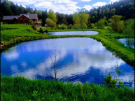 This custom designed log home is set on 15 areas of the most spectacular land you could possibly imagine. Living here is like living in a National Park. The home is a one story with a loft and 2 car attached garage. The main level features a breathtaking living, dining and game room with gas fireplace featuring mosaic Scabos Travertine and a mantle custom made of Montana driftwood. A chef's kitchen with island and huge pantry. The master wing features a king bedroom with gas fireplace (waking up in this bedroom is like waking up in a tree house), a huge master bath featuring a 5' by 5' shower, separate large jacuzzi tub, antique chandelier, and a granite top vanity made from an antique buffet server, a toilet and bidet in their own enclosed space. Additionally, the master area features a huge walk-in closet with laundry folding table and a private vanity closet (this closet could easily be converted into a 3rd bedroom). Also, in the master wing is the laundry room. The first floor also features a very large office/studio complete with a sink, gas fire place and 1/2 guest bath (the area could easily be converted into a second master suite). The loft area features a king bedroom and a 3/4 bath. The dormer area of the loft has been left unfinished for a plentiful arctic/storage area. Most of the interior walls feature custom, high end finishes. The flooring is custom cut Scabos Travertine in the kitchen, laundry and all bathrooms. Acacia hardwood is in the living dining and game area and also in the master bedroom, closet and hallways. The office/studio area is laminate wood flooring. The kitchen countertops are granite over custom maple cabinets. The range is a gas BlueStar 6 burner with grill and it has a double oven. The kitchen island was once a pharmacy counter from 1900. This home also features radiant floor heating, 3 gas fireplaces and state of the art water filtration system. The dry, walkout basement features 10' high ceilings and a double door entry for storage of ATV's and yard maintenance equipment. The property features over 25 ponds and, in its former life, was a functioning trout farm. The ponds are abundant with Rainbow, Brown, Golden and Brook Trout. The property abuts Clapper Hollow Forest on two sides offering endless opportunity for outdoor adventures. There is also an older 3 stall horse barn with a large attached storage space. The entire back of the home has 864 square feet of decking to take advantage of the outstanding views. The total build cost of the house and the property exceeded $500,000. The sellers are looking for a buyer so that they can return to their business in the west. Please consider viewing this property, you'll be glad you did. PLEASE CALL ME, CHRIS, AT 607-214-0028 (landline, no text messages) DO NOT FILL OUT THE FORM AT THE BOTTOM OF THIS PAGE, IT WILL DIRECT YOU TO A REALTOR. I WILL NOT SHOW THIS PROPERTY TO ANYONE WHO HAS ENGAGED THE SERVICES OF A REALTOR.