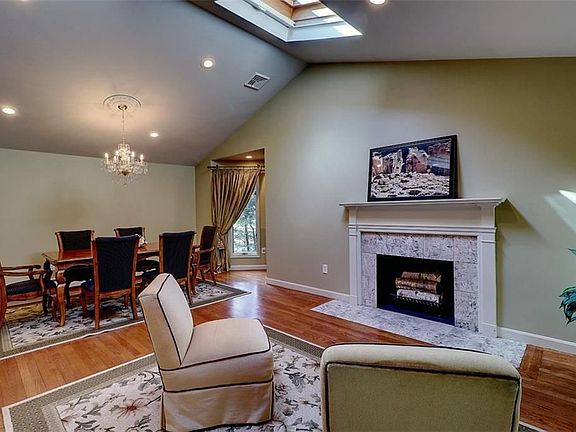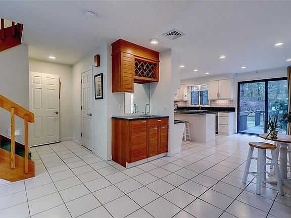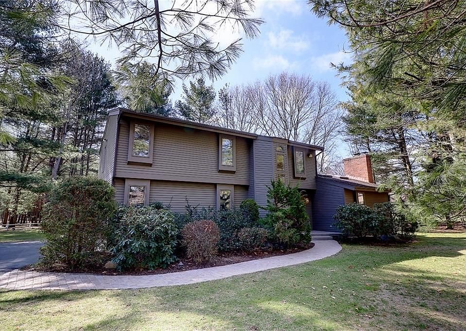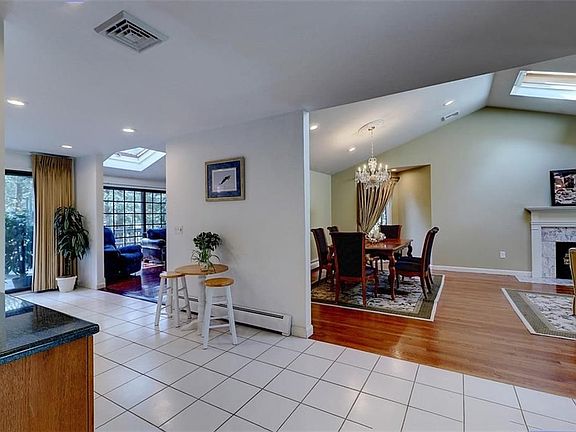 Set on a beautifully wooded and tranquil corner lot, this 4 bedroom contemporary offers a glimpse of nature from every room. Upon entering the home, the gracious foyer opens directly to formal dining room, living room and kitchen.The formal dining and living areas features vaulted ceilings, wood burning fireplace and skylights which allow for abundant natural light. The white kitchen with stainless steel appliances and granite counters is conveniently open to the family room and includes a wet bar with wine rack and a dining area. The family room with vaulted ceilings has a wonderful fireplace, skylights and french doors opening to an outside deck. Upstairs, the master bedroom boasts an ensuite bathroom, vaulted ceilings, skylights and french doors opening to its own private balcony. 3 generously sized bedrooms complete the upstairs with a full bath. A large spacious finished room in the basement is perfect for use as a playroom, gym, office or rec room. Enjoy outdoor living on the spacious back deck which affords ample room for entertaining and al fresco dining, or gather around the fire pit among the evergreens.