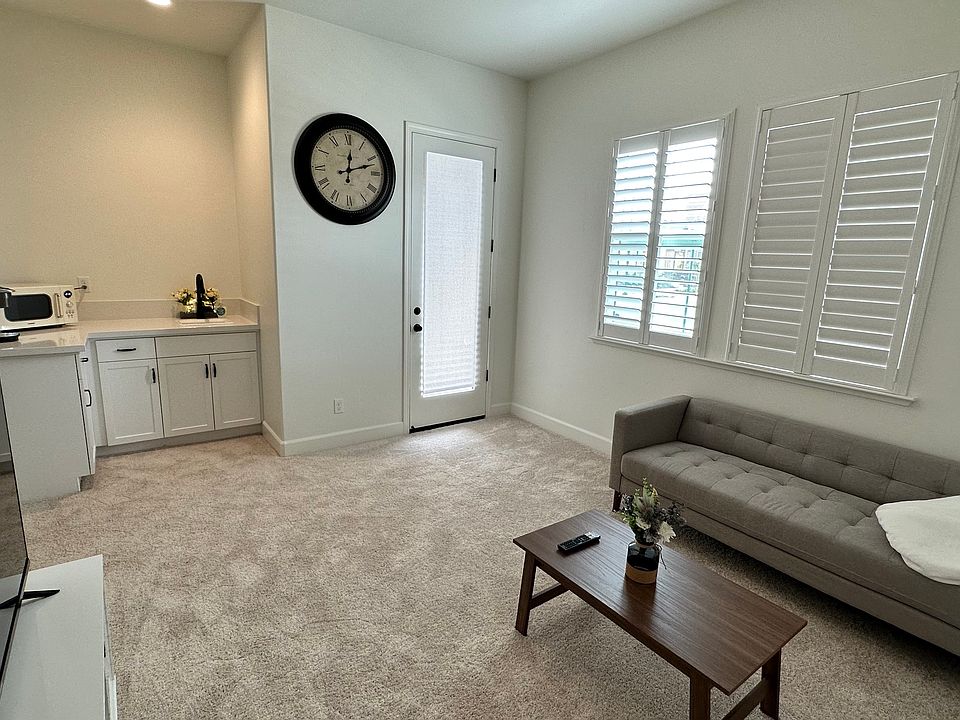 Fully furnished private guest suite available for rent in our newly built luxury home in Marina's Sea Haven community. Suite Features: Private entrance Private living room Kitchenette Private bathroom with walk-in shower (fresh towels provided) Bedroom with queen bed (clean linens provided) Shared Amenities: Chef's kitchen Main Dining, Living room Wi-Fi Laundry room Driveway and street parking No smoking/loitering/partying allowed in or around the premises. Pets are not allowed due to allergies. Overnight guests are not allowed unless approved by roommates and home owner. Parking allowed on driveway and designated parking on street. Observe community HOA rules and regulations.