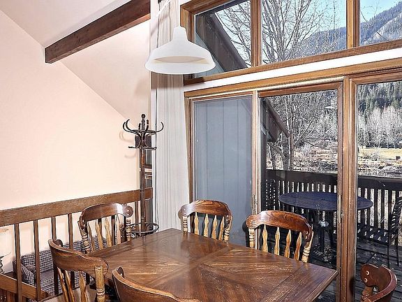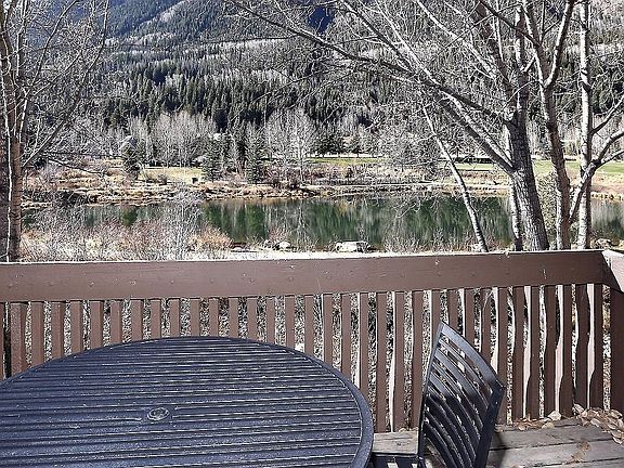 One of the most prime settings and south facing furnished 3-bedroom and 3-bath townhomes at the Vail Racquet Club Mountain Resort. Panoramic views of Gore Creek, mountains, East Vail Chutes, Bighorn Park and pond from a private deck. Multi-level floor plan, loft above kitchen area, wood burning fireplace and multiple windows provide extra light. Short walk to free bus to Vail.