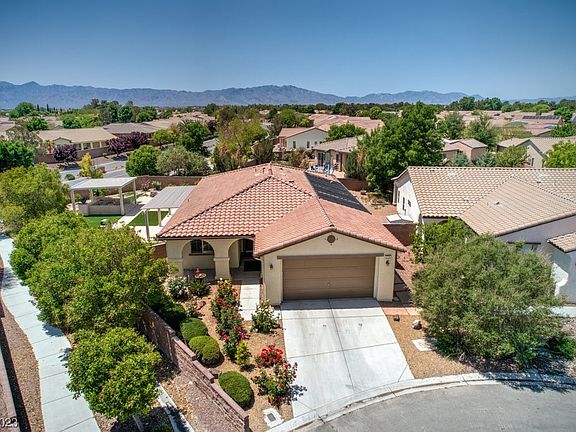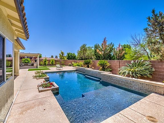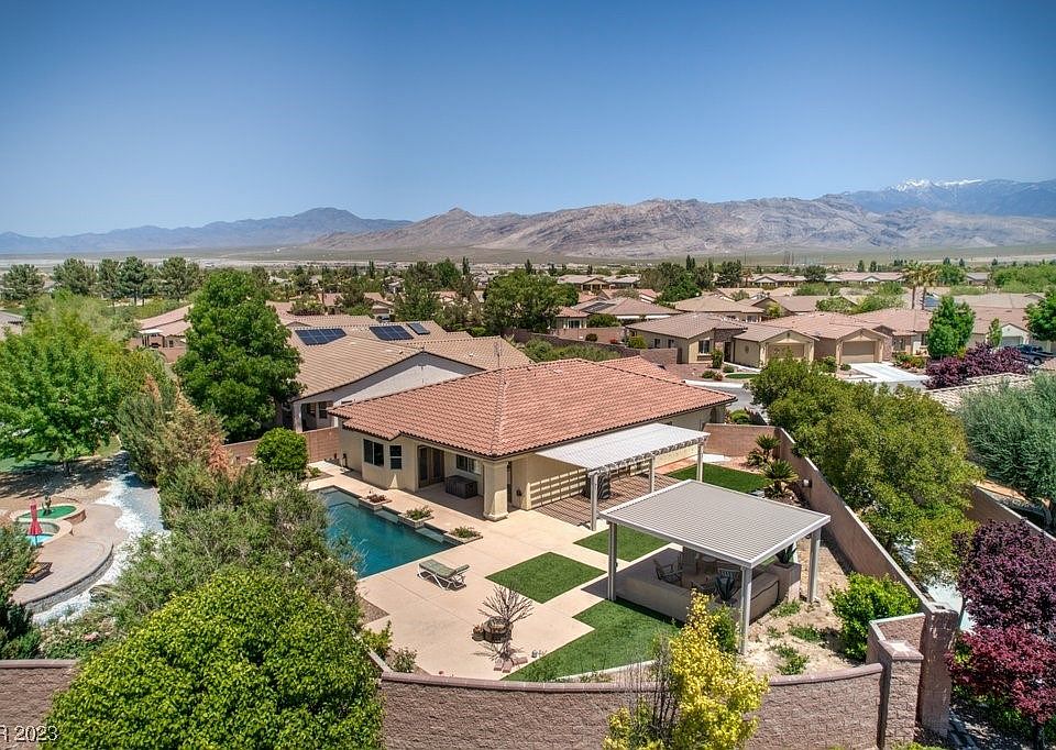 Stunning in-ground pool w/Baja shelf, pergola with raised seating area, kool deck at pool + walking paths, outdoor shower, & 2 sets of French doors connecting indoor living w/outdoor oasis! Pebble tech custom pool is solar heated, has in-floor cleaning system for easy maintenance, & boasts gorgeous tile accent wall! 1,772 sqft home offers open kitchen, shutters, huge primary suite, & 2-car garage. Kitchen has endless cabinets, stainless appliances, pantry, eating area, & easy access to outdoor BBQ area. Primary suite has wood-grain flooring, sitting nook, walk-in closet, dual sinks, & door to pool! 3 bed, 2 full bath, & utility room w/sink. No carpet in this plan 2, in Mountain Falls Golf Community! Drip irrigation on timer, artificial grass, finished landscaping, fresh touchups on exterior paint, turn-key ready! Community has 18-hole golf, driving range, 3 pools, gym, restaurant, parks, & 45 min to Las Vegas! Valley has 3 wineries, gaming, & endless trails for your next adventure!