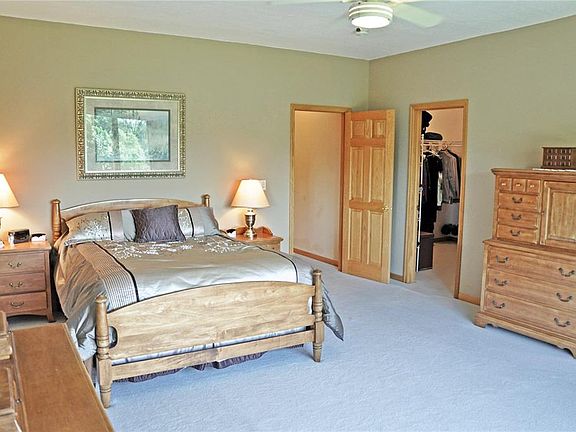 Stunning high quality walkout ranch in Orchard View Estates overlooking a pond on 2.51 acres with wooded views. This home offers many upgrades including an attractive brick front, over-sized 906 sq. ft. attached garage, granite, heated floor in master bath, 6 panel doors, beautiful oak trim throughout, zoned heating, 3 season room, elegant lighting, professional blinds, detached garage, art studio/ playroom, exercise room, and MORE! Newly remodeled kitchen w/ granite on counters, breakfast bar, & hutch, beautiful custom white cabinets, back-splash, & wood flooring. Great Room has a huge transom window overlooking the pond & wooded views, sharp gas f/p, & vaulted ceilings. The spacious master BR has great views, walk-in closet, & master bath w/ jetted tub, separate shower, & heated floors. The open style layout ensures plenty of space and natural light to feel like home. You need to see this elegant home inside to see all the extra detail & beautiful hardwood floors in the kitchen, & hallway. Lower level walkout to patio area, recreation room, 2 BR's, full bath, -art studio/workshop with bay windows, exercise room & lots of storage. You will love the deck & Three Seasons room w/ stunning views.