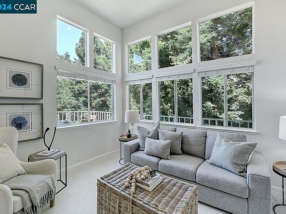 Beautiful private remodeled top floor end-unit with views of golf course and surrounded by redwoods. Light-filled with dramatic high ceilings & large picture windows, spacious living room, fireplace and large private deck. Top quality upgrades throughout, forrmal dining room. Kitchen has shaker cabinets, Corian counters, Kitchen Aid appliances, handsome floors. Spacious main bedroom has door to private deck w/view of the course. Remodeled main bath with beautiful slate floors including surround in large step in shower w/tiled floor, double sink vanity w/full size mirror, large walk-in closet. Separate laundry room w/ full size LG washer/dryer & linen cabinets. New paint throughout, custom new carpet, leveler blinds, recessed lighting, garage/carport.