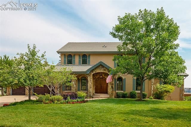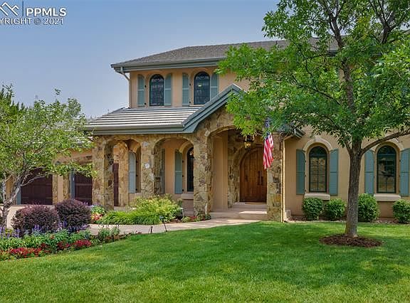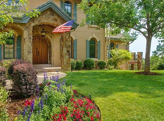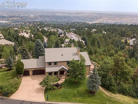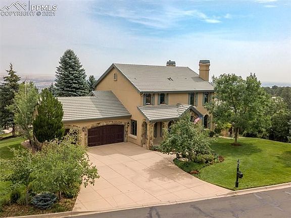 The best of both worlds! Gorgeous Cheyenne Mountain vistas from the front of the house and side deck, expansive Colorado cities twinkling below across the rear of the house and back deck! Open the dramatic double wood doors to this truly pristine home with new wood floors, new Pella windows and new paint, stucco, elastomeric and shutters completed in 2021. Warm Alder wood doors throughout! Open floor plan with easy flow between living room, library, kitchen, butler's pantry, and dining room. The Great room has an awe-inspiring, 2-story copper fireplace hood that soars upward towards the upper-level balcony for a dramatic feel. The library's focal point is the stone fireplace, with built-in bookshelves on both sides. The gourmet kitchen has granite counters and an eat-in granite table contiguous to the island, and a desk work area too! Beautiful appliances and cabinetry! The Master bedroom, with an en-suite 5-pc bath with Jacuzzi tub, is on the main level with a walk-out to the covered back deck and adjoining side deck. 3 bedroom suites are upstairs, with balustrade overlooking main level, and downstairs has a huge recreation room with a walk-out, bedroom, full bath, family room and bonus room. The large 45-foot covered back deck is a perfect place to enjoy the outdoors and huge back yard with mature trees. It adjoins another large open side deck, where you can admire the beautiful wildlife roaming through the yard and the very large adjacent, protected open space and the sweeping, unobstructed views of Cheyenne Mountain. The oversized 3-car garage has built-in storage throughout and a picture window over the work bench. The home is a smart home, with smart locks and garage doors, smart interior and exterior lighting, 3 Nest thermostats and security system monitored by the BRC guards. Lock and leave with peace of mind! Some of the Sellers' furnishings are negotiable for purchase.