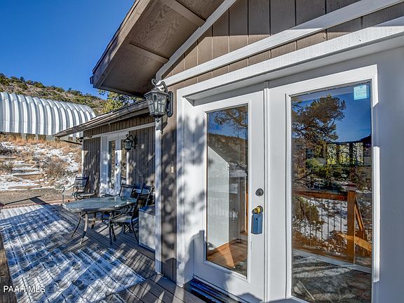 Charming Country home in the Hills of West Chino Valley. Enjoy the privacy, peace, mature trees and Mary's Mesa from the wrap around deck. The main living space boasts an open, great room floor plan. Walls of windows to take in the views and natural light. Wood burning stove adds ambiance and warmth. Primary bedroom is spacious, and the bathroom has a stacked washer and dryer for main level living comfort. The lower living space includes a living room, 2 bedrooms and 3/4 bath, laundry and kitchenette space. Entrance from interior as well as exterior. PAID SOLAR! Huge Quonset building with 14'x12x'garage door can store your RV, or 4 vehicles, and a workshop. 12'x36' Barn and well house is great for storage, she shed. 2 gated entrance locations. Just 10 minutes to grocery schools, medical