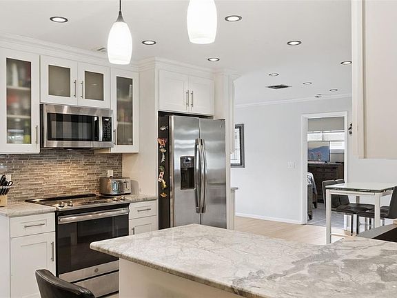 Fenced-in yardBreakfast barGranite countertopsIsolated primary bedroomNeutral color paletteRenovated eat-in kitchenStone facade