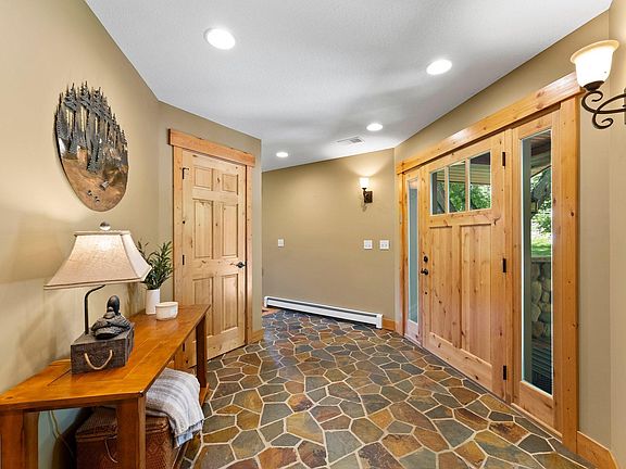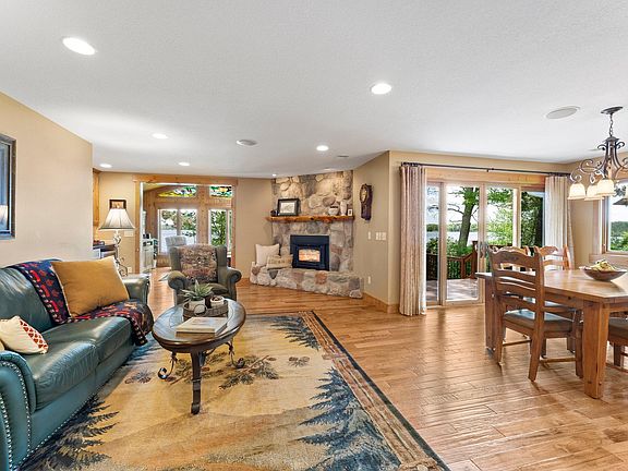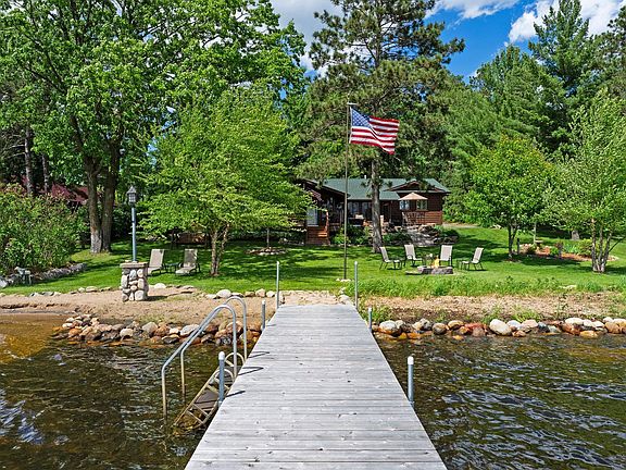 This exquisite lake shore rambler on almost 1-acre of prime Upper Hay Lake. Spacious foyer transitions seamlessly into the open living area, complete with recessed lighting, built-in surround sound, and hand-scribed hickory wood floors. The family room boasts a gas-burning fireplace and a convenient wet bar, while the kitchen offers rustic hickory cabinets, a farmhouse-style sink, and top-of-the-line appliances. The primary suite, a luxurious retreat with a walk-in closet and private porch access, includes a spa-like bathroom with a designer soaking tub and travertine tile. Two additional bedrooms and bathroom on the main level. Lower level family room, 2 bedrooms, 2 bathrooms, and laundry room. Additional features include a large wrap-around deck, a terraced patio, and 100 feet of sandy lakeshore. The property also includes a 30X40 pole barn, an additional shed, and a heated 2+ car garage, with major renovations completed in 2009 and a new roof and gutters added in 2023.