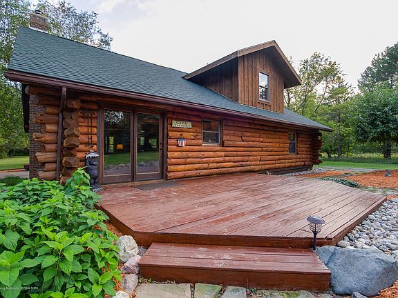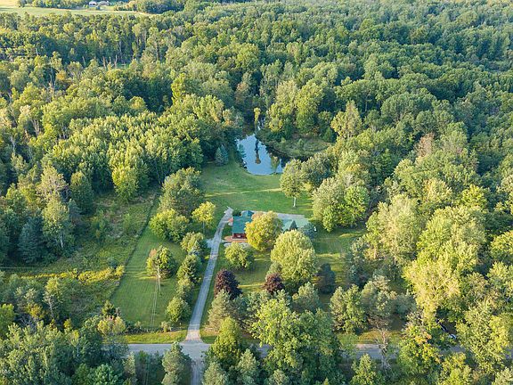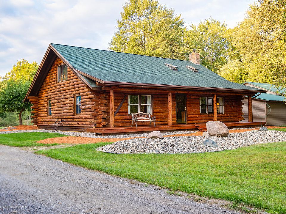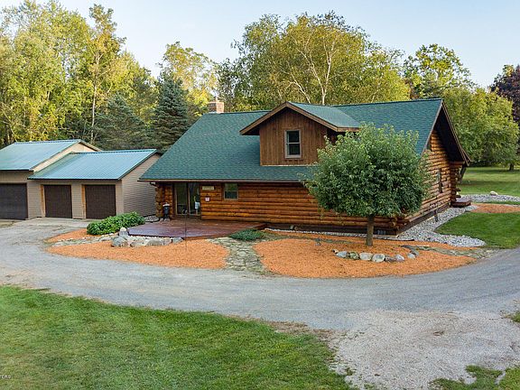 Open Sunday 9/16 12-2A majestic 20 acres is where you'll find this beautiful custom log home. Beautifully landscaped. Incredible views of trophy, white tail deer playing by the huge stocked pond that has a 12step waterfall and fishing/observation deck. Property is wooded with manicured trails. The 2100+sf, 3 bed/2 bath home has a 2 story great room with skylights, fieldstone fireplace and open kitchen/dining. 2 bedrooms, full bath w/ff laundry. 2nd floor 27x23 open loft w/full bath could be master or family room. Huge deck off the dining and a covered front porch. A 4 car 35x45 garage w/workshop plus a 30x50 pole barn w/30x65 fenced kennel. Landscape lighting on the trees along the drive will guide you home to the peace and solitude that awaits.