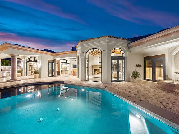 Stunning custom estate at the Vintage Club! Four bedroom, five full baths and three powder rooms including two bedroom guest casita, plus gym and office suite. Approx. 6,882 sq. ft. on .47 acre lot. Features circular drive to courtyard entry with custom fountain. Formal entry to living room with fireplace and step down wet bar. Formal dining room and gorgeous wine cellar. Gourmet kitchen with center island and counter bar, top of the line appliances and adjacent family room with media and built-ins. Large master suite with fireplace and lavish bath with his and her closets and gym access. The guest accommodations are first class with two bedroom casita with sitting room and wet bar. Over the garage is the two room option now used as an office and suite. Unique sitting room with fireplace opens to the back patio creating an indoor/ outdoor entertainment area. Entertaining is complete with built-in BBQ kitchen, custom firepit with seating, infinity pool and separate spa. Amazing golf course views and a hard to find six car garage make this a must see property! *Note that property photos include virtual staging