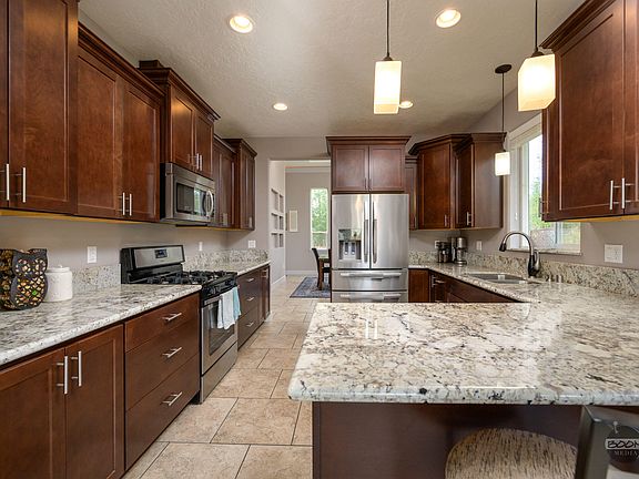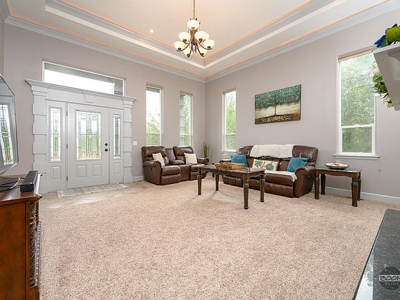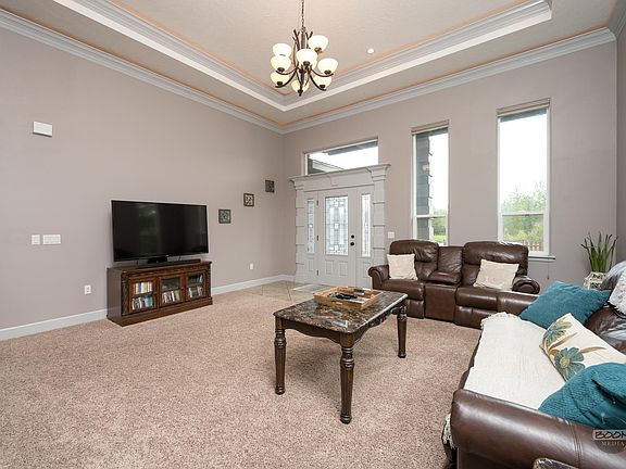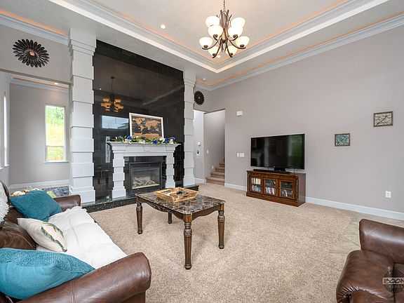Must see home on .92 acre lot! Grand 12 ft ceilings downstairs with eye-catching floor to ceiling wall of granite around gas fireplace, custom trim & coffered ceiling with in-direct lighting, lots of recessed lighting. Granite in kitchen and all baths. Beautiful kitchen with upgraded cabinetry, eat-in nook, breakfast bar and large formal dining room. Hall bath has dual-sink vanities.