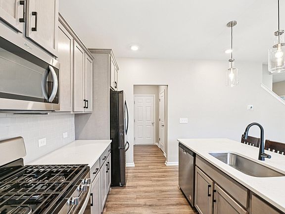Discover the perfect blend of space and serenity in this well-maintained 5-bedroom, 3.5-bath home located in the desirable Clayton community. Nestled in a quiet neighborhood, this two-story beauty offers thoughtful upgrades, a functional layout, and a peaceful backyard view of the trees—making it feel like a private retreat. Step onto the charming covered front porch and into a bright, open living space. The kitchen is the heart of the home, featuring a center island with built-in sink, stylish tile backsplash, and ample cabinet space—ideal for cooking and entertaining. Just off the kitchen, enjoy casual outdoor living on the rear patio, perfect for grilling or relaxing with a morning coffee. The layout includes a first-floor bedroom and full bath, offering flexibility for guests, an office, or multi-generational living. Upstairs, you'll find the spacious main bedroom suite—a true owner's retreat with room to unwind and recharge—along with additional secondary bedrooms and a conveniently located laundry room. The attached two-car garage has been upgraded with added storage, along with smart enhancements in the laundry area, maximizing functionality and organization. With its combination of comfort, upgrades, and a tranquil backyard treeline view, this home is ready for you to move in and make it your own. Don't miss this opportunity to own a beautifully designed home with space for everyone—schedule your showing today!