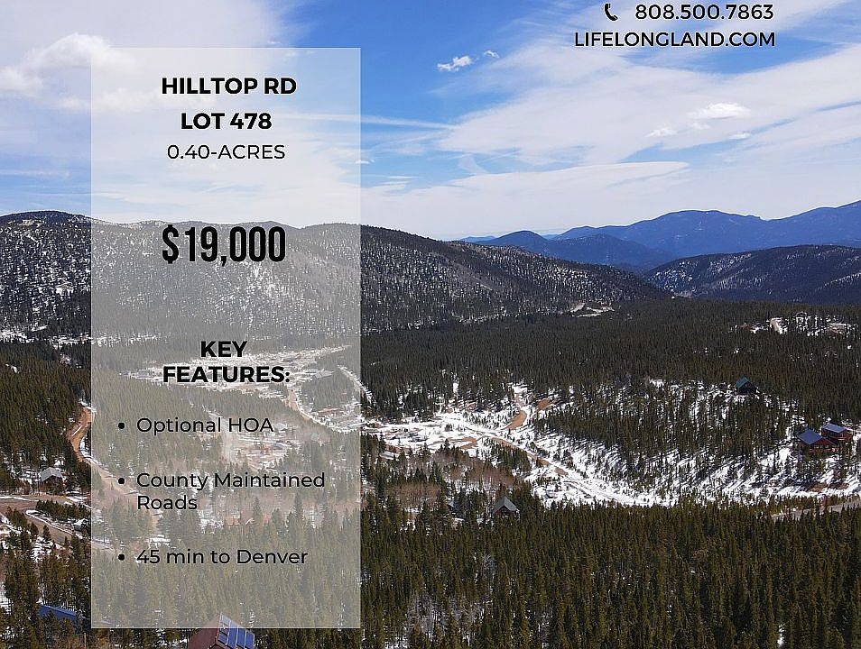 $10k below market value - a deal for this highly sought-after area! - LEGAL DESCRIPTION: SAINT MARYS SUBDIVISION Lot: 478 U3319/611 319/566 DC 557/76 662/600 - LOT: Lot 478 - ELEVATION: Approx 10,500 ft - ROAD ACCESS: Each property within the subdivision has maintained frontage to county-maintained roads - LOT SIZE: 0.40-acres - ANNUAL TAXES: $168.82 *2021 taxes have been paid. No past due taxes or tax liens on the property* Hilltop Rd Lot 478 offers stunning mountain-facing views from almost every direction. This is an incredible opportunity to own in the St. Mary’s subdivision in Clear Creek County, Colorado. With its excellent proximity to Idaho Springs just 12 miles away and bustling Denver just 45 miles away, the activities and adventures are endless. Additionally, the community itself offers a beautiful location with breathtaking mountain homes nestled high in the Rocky Mountains.