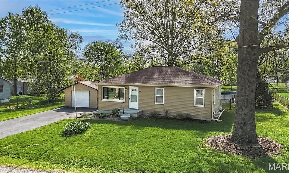 Great affordable starter home with 3 bedrooms, 2 oversize garages 24x16 and 20x18, sitting on a level 1/2 acre plus fenced yard. With mostly cosmetic updates someone can make this one their own. All the major systems are newer: Roof/Soffit/Fascia 2017, Siding 2014, Composite deck 2023, Windows 2013, HVAC 16 seer in 2023, Water Heater 2017, Bathroom 2012. Updated electrical service completed in 2011. Enter into spacious 16 x 15 living room open to 15 x 11 eat in kitchen. Bonus sun room off the kitchen. 12 x 11 primary bedroom and both secondary bedrooms are 11'4" x 9'-1". Hardwood floors in most areas and they will refinish beautifully. Basement is unfinished and dry. Sump pit and pump is manually activated and primarily for condensate from A/C. Area under back porch could make a cute wine cellar. City of Arnold offers lots of parks, one within walking distance, a recreation center with pools, and abundance of restaurants and shopping and conveniently located near highways. Come see!