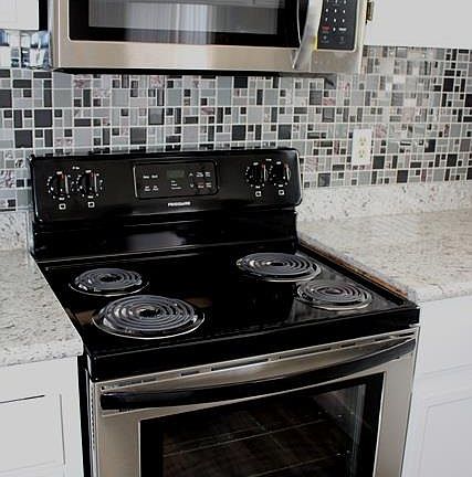 - KITCHEN FEATURES: Dishwasher, Electric Range/Cooktop, Garbage Disposal, Range/Oven Free Standing, Microwave, Counter - Solid Surface, Counter - Stone