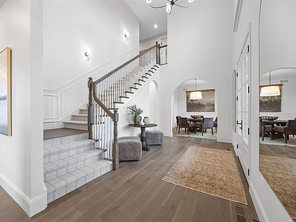 The 2025 Coastal Colonial by Elevation Homebuilders—a 2025 Parade Home. A personal favorite as a tried-and-true floor plan designed for entertaining. Dramatic two-story open foyer with a towering 12' bay window study, setting the stage for elevated interiors and impressive scale. With 10' ceilings throughout the main, the layout offers intentional zones for living, sitting, dining and gathering. Built-in eat-in breakfast, formal dining with built-in cabinetry, and a show-stopping kitchen paired with a prep kitchen and pantry. Architectural details: arched doorways, tall 8' solid core doors, thick crown molding, and designer finishes throughout. The mudroom with arched built-in benches and stone surfaces, elegant built-in laundry, and two gas fireplaces. Primary suite features vaulted ceilings, zero-entry tiled shower framed in arched stone molding, separate vanities, and a bonus makeup vanity. The lower level includes a wet bar, ideal for entertaining, and opens to a walkout patio, large deck, and covered porch. Show-stopping trends and finishes throughout. Lot 7.