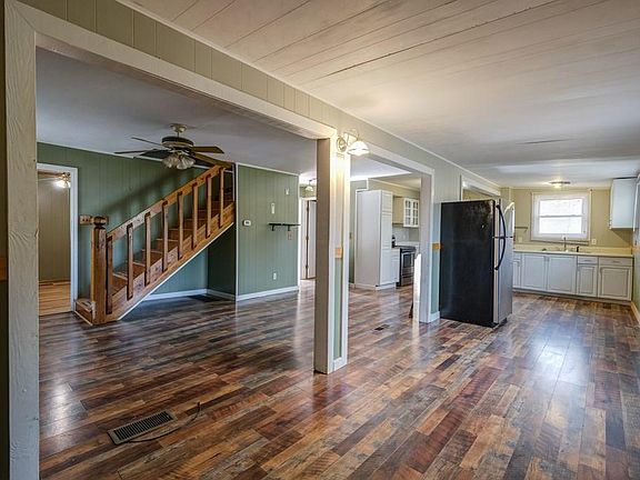 WANTED: Some TLC to make this private hilltop home shine! This 3 bed, 1.5 bath had some renovations started with some new flooring, appliances in the kitchen but is in need of a handyman. Your Great Room has a stone fireplace with a wood burning stove insert to warm the chilly evenings and room for your dining area. A laundry room, guest bedroom and bathroom with a standing shower and whirlpool tub is on the main floor. Upstairs you will find two additional bedrooms with a half bath and French doors to a private balcony. A workshop is located outside in high crawl. Detached carport and a big deck for sitting, relaxing and looking down on the pond and land below.