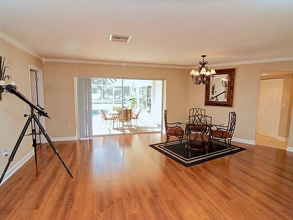 Distinctive 3 bedroom, 2 bath split plan pool home with eat-in kitchen, family room, indoor utility. Updated baths, hi grade laminate floors & tile throughout. Crown molding compliments every room. Enjoy the stunning water & golf course view from the screened lanai with cyrstal crete pool. Other features include two car garage, circular drive for extra parking & metered irrigation system with automatic timer. Ownership includes a social membership at Bent Tree Golf Club. This is a beautiful home located in mature wooded community that is conveniently located to I-75 and all of Sarasota's many amenities.