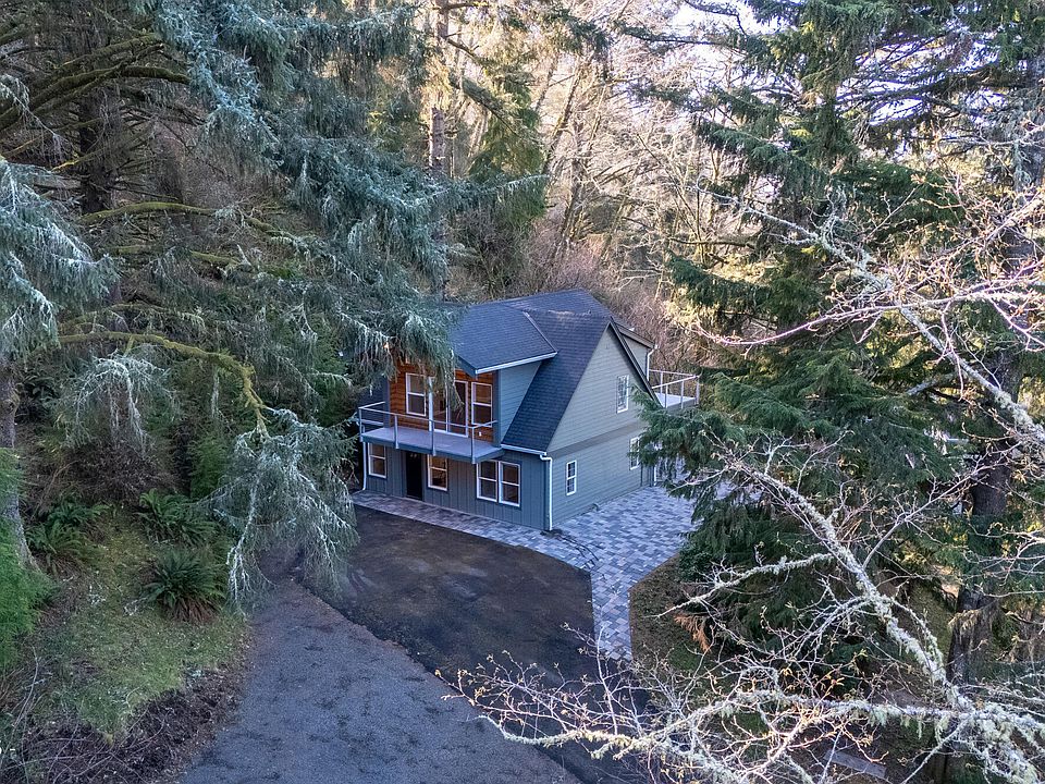 Perched on a large lot with forest views and a peek of the ocean is this well appointed, fully renovated home. Close to the Neskowin beaches, Proposal Rock & charming Neskowin Village. The covered front door leads to a spacious entryway with a beautiful stairwell. Main Level: 2 Bedrooms have closets w/built-ins, full Bath w/walk-in shower, included washer + dryer, den/ office space has access to the covered paver patio that extends to the custom firepit. 2nd Level: Enjoy a dream Kitchen w/custom Alder cabinets, gorgeous quartz counters and new stainless steel appliances. The upstairs main Living area has vaulted wood & beam ceilings with an expansive window wall & sliding glass door leading to the covered east facing deck, perfect for listening to the sounds of the creek and nature with a delicious beverage! The Bedroom with a walk-in closet features a sliding glass door opening to the private west facing deck. Take in peeks of the ocean and watch the sunset through the trees. Separate, upstairs full Bath w/tub + shower combo. Renovations highlights include: LVP throughout, tiled floors in bathrooms, solid wood doors, beautiful custom cabinetry & quartz counters throughout, new roof, fresh exterior paint, decks with waterproof membrane (just hose and sweep off), new heat pump with air handler, new paver patio, plus much more!
