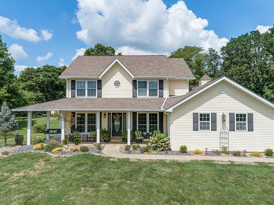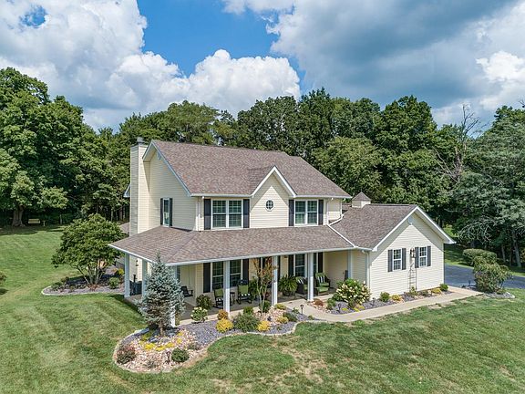 Welcome to this remarkable home located on Quail Run Estates. This exquisite home has been recently renovated. You are going to fall in love as soon as you open the front door! There you will find a beautiful staircase, spacious dining room to your left and a tidy office to your right. You also are going to love all the new features added, from the crown molding to the built-in bookcases around the fireplace you will be amazed at the great craftmanship. Full custom renovation on the interior in 2020. Kitchen features all new stainless steel GE appliances in 2020, New granite countertops, 2 pantries, generous cabinet space, custom plantation shutters, custom under cabinet lighting. Wall-mounted 65 inch tv with soundbar will stay. All new lighting fixtures throughout home. Full basement, stamped patio and stone fire-pit. 12x20 shed This home sits on over 2 acres of ground & backs to woods. Homes has Lake views. small orchard, & Home Warranty. Ask for the list of all the updates!