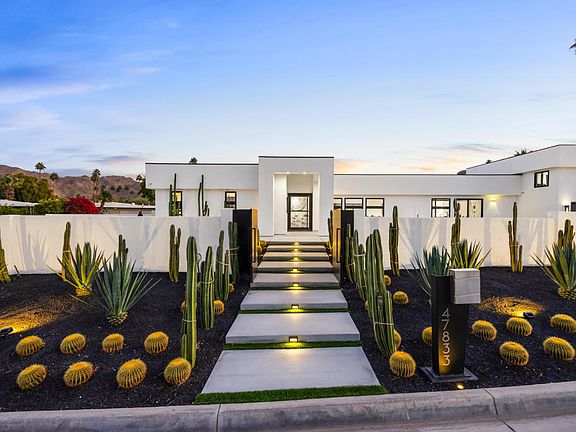 This stunning 3-bedroom, 3-bathroom contemporary home, originally built in 1957, underwent a full ''studs-out'' remodel, blending sleek, modern finishes with exceptional design. Located in the highly sought-after historic Silver Spur Ranch community in South Palm Desert, this home offers an abundance of natural light, creating a warm and luxurious ambiance. Large windows, a custom oversized fireplace, modern cabinetry, high-end finishes, and designer fixtures provide an elegant yet comfortable atmosphere throughout. The chef-inspired kitchen features two sinks, a built-in Dacor smart refrigerator, Z Line appliances, and a spacious island. This home includes two generously sized primary suites on opposite sides, each with walk-in closets and spa-like bathrooms for ultimate privacy. An additional guest room, currently a home gym, can easily convert into a third bedroom with a king-size bed. Set on a low-maintenance, professionally landscaped lot, this home sits elevated for stunning mountain views and complete privacy. Outdoor amenities include a 9-ft deep pool, bocce ball court, life-sized chess set, fire pit, dining area, BBQ, and multiple lounge spaces--ideal for entertaining. Conveniently located near the Living Desert Zoo, hiking trails, golf courses, and just minutes from El Paseo's upscale shopping and dining, this home offers the best of desert living. This is a must-see for those seeking a sophisticated desert retreat!