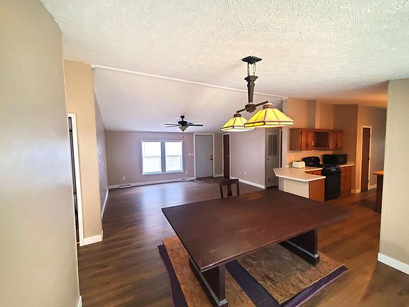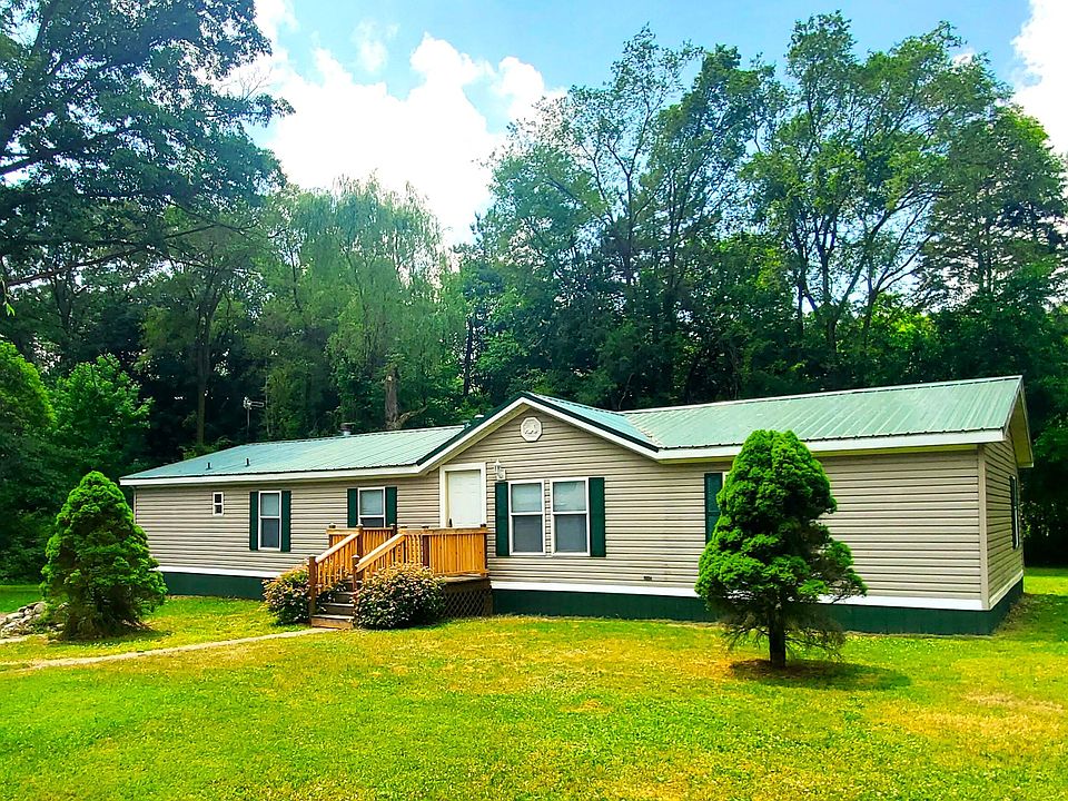 This 3 bedroom 2 bath ranch style double wide sits on about 2 acres surrounded by woods. The inside is set up with 2 bedrooms 1 bath on one side with the owners suite in the middle to one side with access to the mudroom out back and the front living area. Kitchen has a large counter space with an island and pantry area. There is a wood burning fireplace in the family room/living room area. There is a wood stairs to the front door and a wood deck with ramp to the back slider. There is a 2 stall garage that has a wood stove to heat and a large upstairs area that is an clean slate floor plan that you could do whatever you want with plus a shed out back. Definitely one you don't want to miss out on.